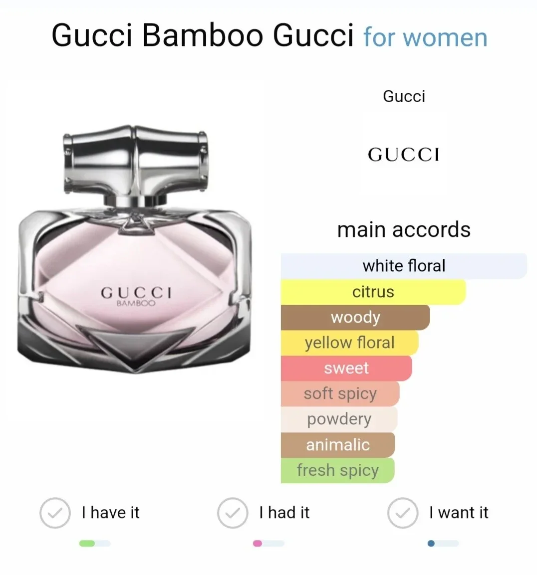 Les stylistes de la marque Gucci adorent le bambou et ils l’utilisent donc souvent, par exemple comme anse des célèbres sacs à main de la marque. Leur fascination pour cette plante est également visible sur l’aspect du flacon du parfum Bamboo. Le verre y est taillé comme un diamant et le bouchon de couleur argentée représente les nervures caractéristiques du bambou.