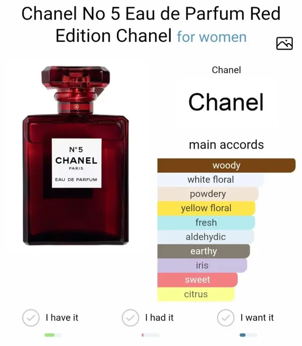 L'Eau de Parfum Chanel N° 5 Édition Rouge de Chanel est un parfum floral et aldéhydé pour femme. Lancée en 2018, elle est signée Jacques Polge. Ses notes de tête sont l'Ylang-ylang, les Aldéhydes, le Néroli, la Bergamote et la Pêche ; ses notes de cœur sont l'Iris, le Jasmin, la Rose et le Muguet ; ses notes de fond sont le Bois de santal, la Vanille, la Mousse de chêne, le Vétiver et le Patchouli.