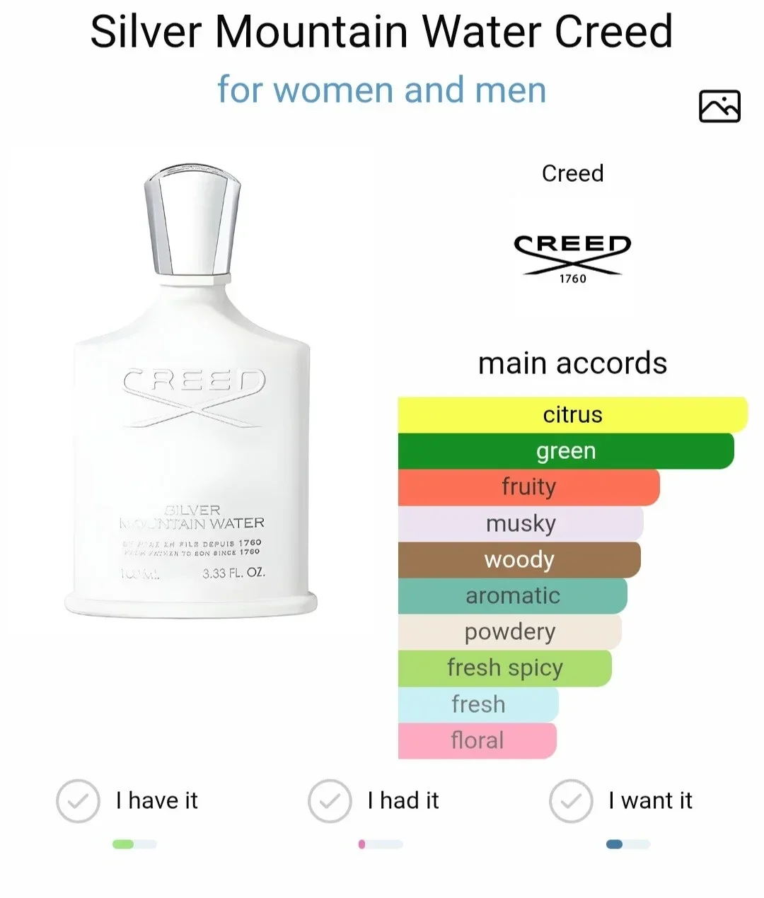 L’eau de parfum Creed Silver Mountain Water a été introduite sur le marché en 1995. Pour créer sa composition olfactive, le parfumeur Olivier Creed, fervent amateur de ski alpin, a puisé son inspiration dans les montagnes aux sommets enneigés qu’il affectionne. Le flacon du parfum Silver Mountain Water évoque les flancs de montagne couverts de neige et les ruisseaux gelés qui forment dans les Alpes Suisses des formes insolites.