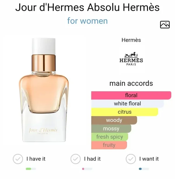 Jour d’Hermès Absolu est créé par le parfumeur Jean-Claude Ellena en 2014. La composition est un absolu de féminité et de fleurs. « Je désirais une signature appuyée, au plus près du corps de la femme. On voit ses épaules, son cou, on peut la toucher, la sentir. »