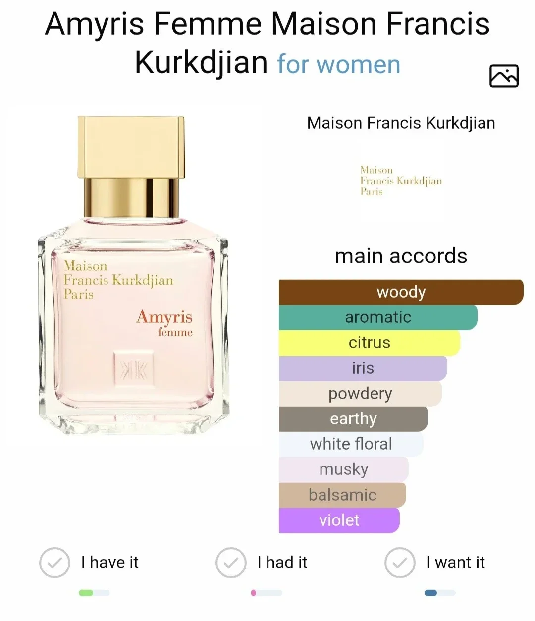 L’eau de parfum Amyris femme Maison Francis Kurkdjian est une fragrance lumineuse née de l’union de l’amyris de Jamaïque et de l’iris de Florence, un mariage irrésistiblement séduisant à l’élégance naturelle affirmée. Ce parfum floral fruité et féminin vous envoûte dans un tourbillon joyeux, une envolée de fleurs de citronnier et de pois de senteur enflammant un accord ambré musqué. Laissez-vous emporter par cette danse passionnée et virevoltante.