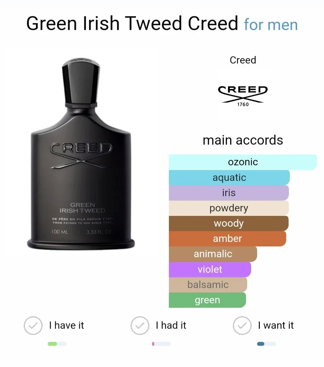 Le parfum Green Irish Tweed est le plus célèbre et le plus vendu des eaux de parfum de la marque Creed. Sa composition évoque parfaitement la fraîcheur de la nature irlandaise : herbe fraîchement coupée, prairie au printemps, fleurs d’été et herbes aromatiques enveloppées par une légère brise marine.