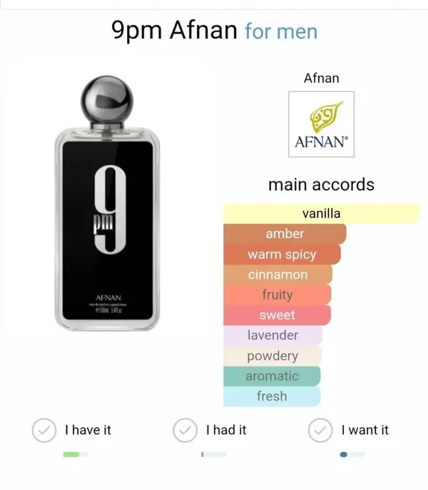 Vous trouvez parfois votre vie trop active et vous ne semblez pas pouvoir vous arrêter ? Mais vous l'aimez quand même ? L’Eau de parfum pour homme Afnan 9 PM Afnan est le parfum qu'il vous faut. Son caractère épicé correspond parfaitement à votre style de vie énergique. Ce parfum masculin vous ouvrira toutes les portes et s'intégrera parfaitement à votre rythme de vie.
