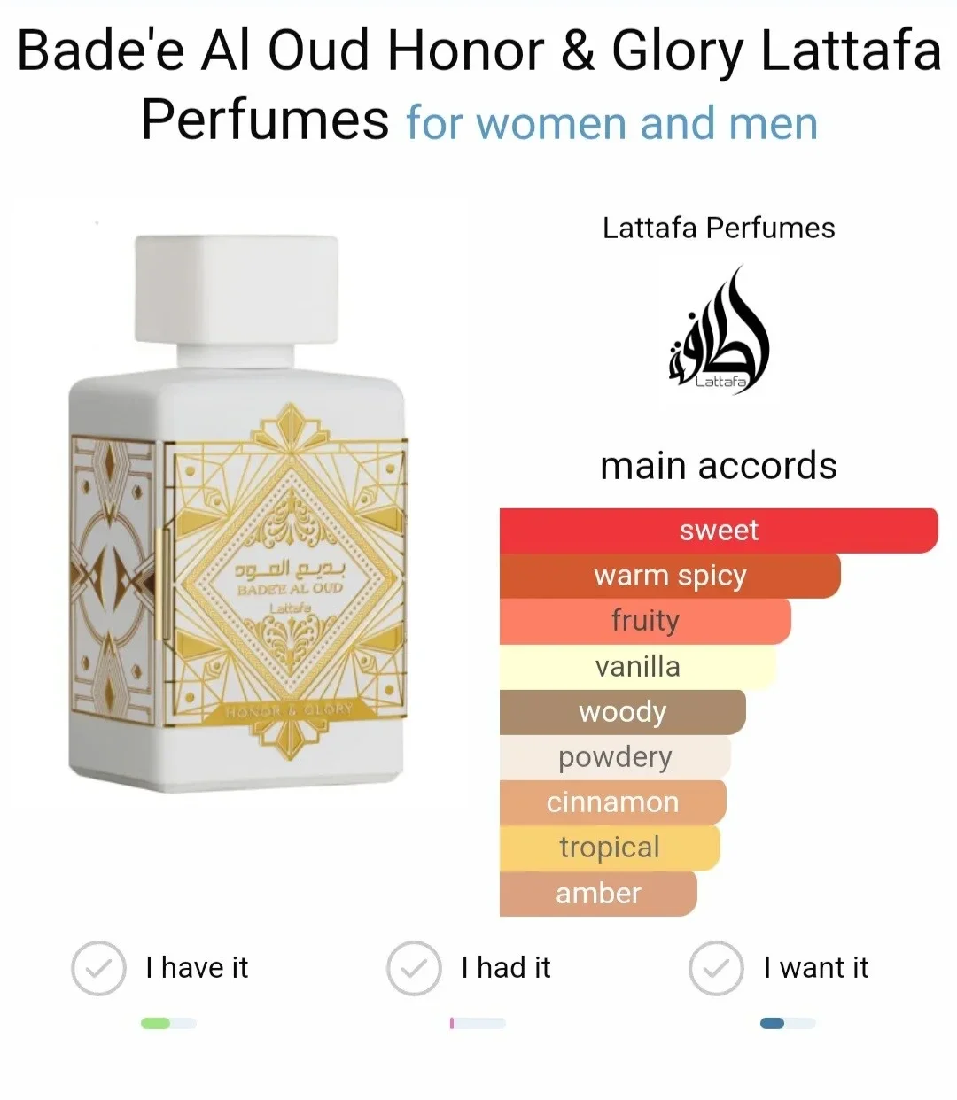 Que vous soyez à la recherche d’un parfum à porter au quotidien ou pour une occasion spéciale, Lattafa Badee Al Oud Honor & Glory est exactement ce qu’il vous faut. Il propose une composition adaptée aux hommes et aux femmes, qui célèbre les sens et raconte une histoire pleine d’élégance, de passion et de noblesse.