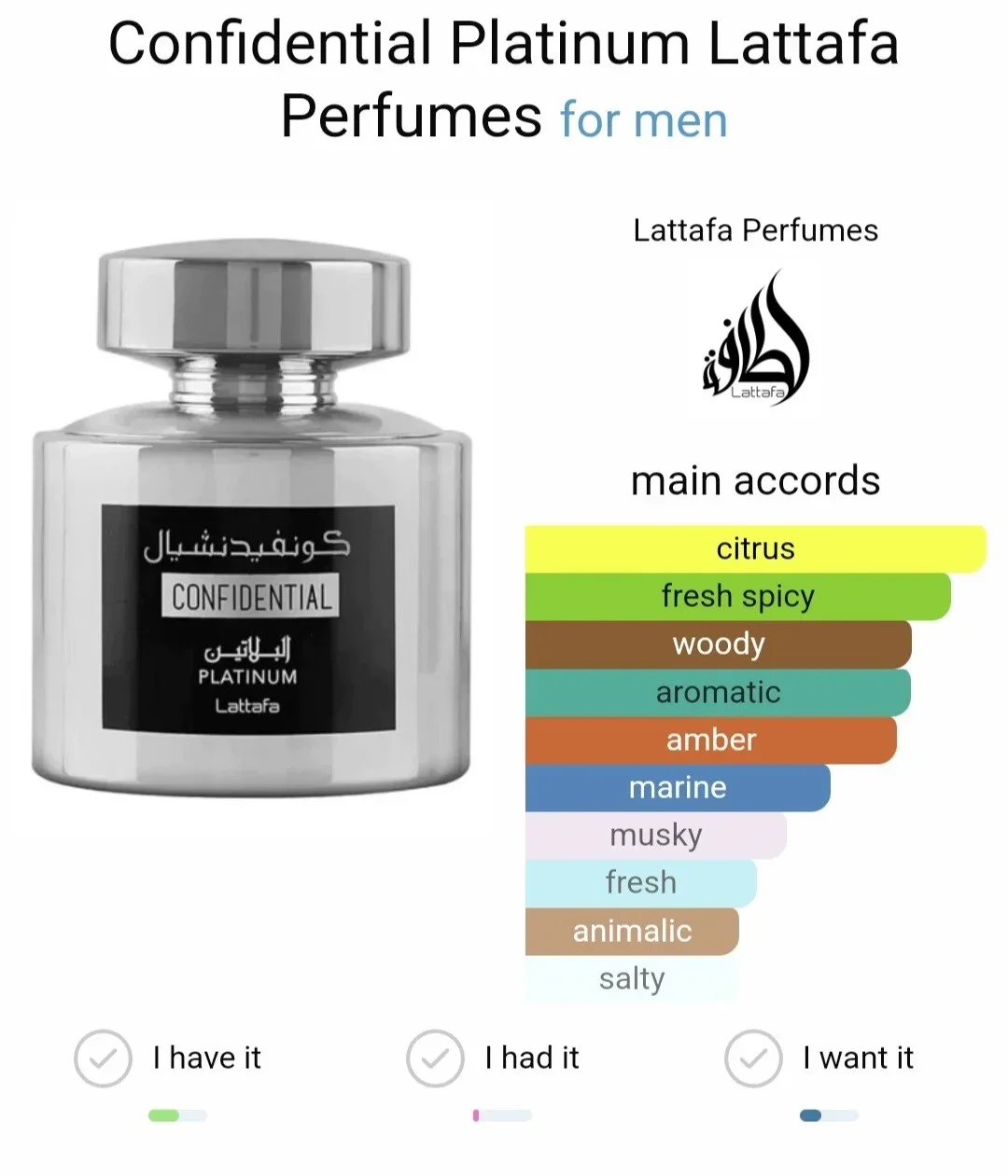 Relevez chaque défi avec fierté et sans détour ! Il n'est pas nécessaire d'attendre et vous êtes plus fort que vous ne le pensez. L'Eau de Parfum mixte Lattafa Confidential Platinum scellera votre confiance et votre estime de soi et chaque jour vous rapprochera un peu plus de votre objectif. Elle vous donnera une empreinte élégante qui attirera l'attention de votre entourage.