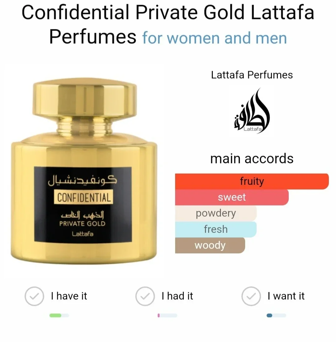 Découvrez la magie des parfums arabes authentiques. L’Eau de Parfum mixte Lattafa Confidential Private Gold reflète la véritable définition du luxe et de l'élégance de la culture arabe, en véhiculant son héritage à travers des fragrances enivrantes.