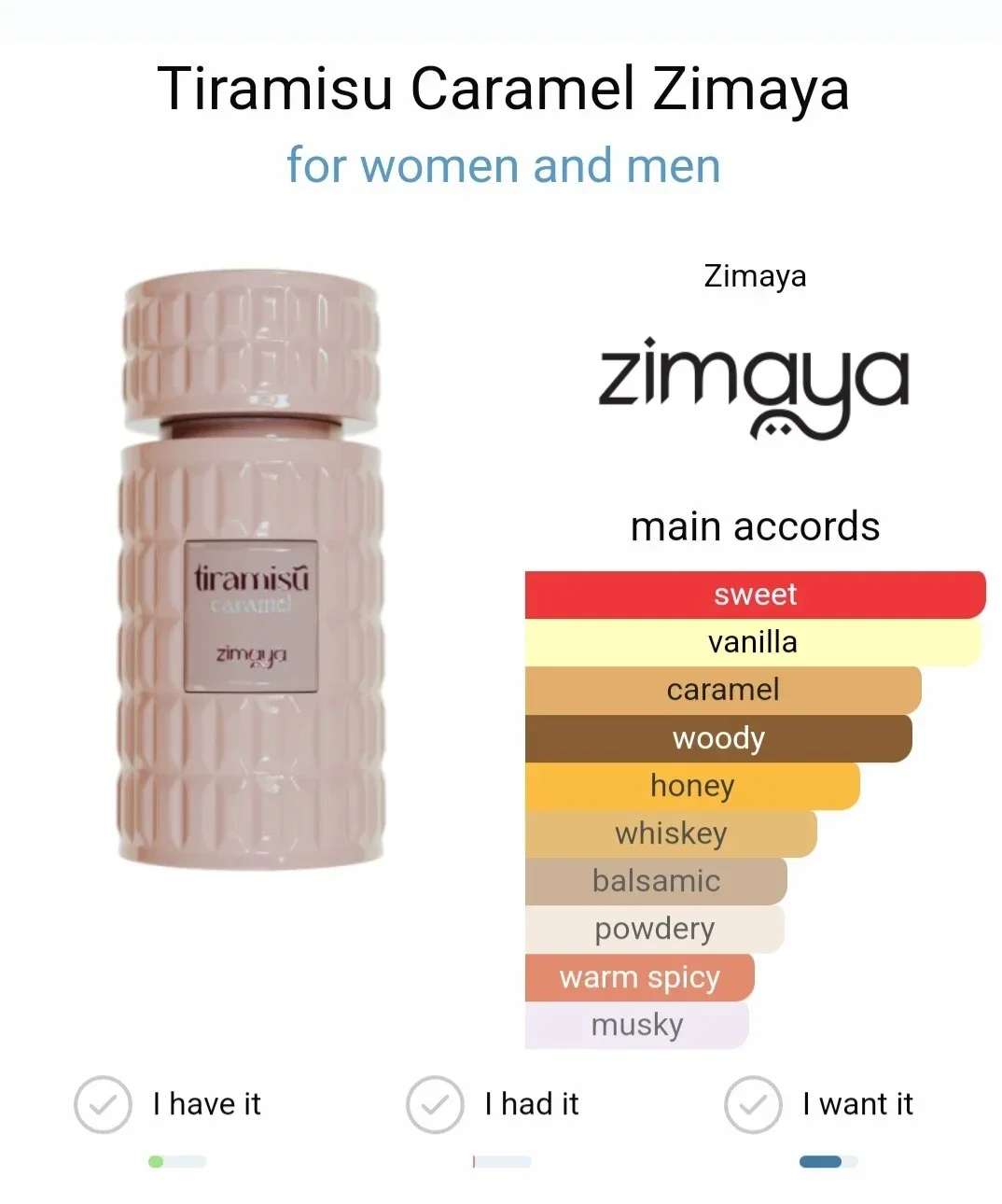 Voici un parfum qui conjugue sensualité, douceur et sophistication. L’eau de parfum mixte Tiramisu Caramel de Zimaya est gorgée de notes chaleureuses de caramel, de vanille et de musc subtil qui s’entrelacent pour former une composition harmonieuse. Découvrez la douceur qui apporte une sensation de paix, d’élégance et de luxe à chaque inspiration.