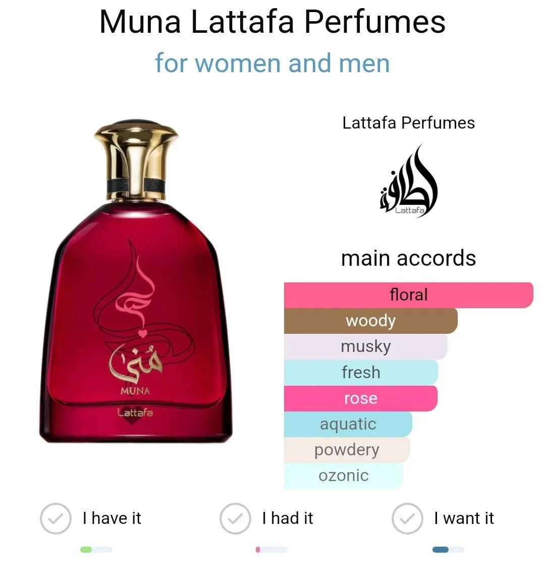 L'eau de parfum pour femme Muna de Lattafa Perfumes porte un nom arabe unique. « Muna » est un prénom féminin qui signifie « désirée, convoitée ». Il représente également une femme dotée d'une force intérieure puissante et d'une énergie créatrice. Muna de Lattafa Perfumes est conçu pour cette beauté. Ses notes révèlent une beauté délicate, fruitée et florale, ainsi qu'une force redoutable, conférée par des accords de bois et de musc. Ce parfum est conçu pour révéler vos plus belles qualités et booster votre confiance en vous.