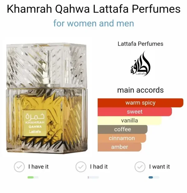 La marque Lattafa a été fondée en 1980 par Sheikh Shahid Ahmad et son associé Shoaib Iqbal, avec l’ambition de créer des parfums luxueux de qualité pour les clients du Proche-Orient. Son nom est dérivé des mots arabes « Latif » signifiant « gentil, doux » et « Lateefa » traduit par « agréable ». En 1992, Lattafa étend son champ au-delà des frontières du Proche-Orient. Aujourd’hui, plusieurs décennies après sa fondation, elle est devenue une maison de parfumerie influente qui exporte ses parfums somptueux dans le monde entier pour des clients qui apprécient le véritable luxe. Le parfum Khamrah Qahwa est une excellente incarnation du riche patrimoine olfactif arabe dont la marque Lattafa se fait ambassadrice.