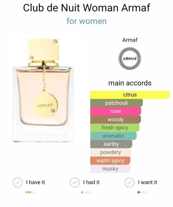 Le parfum Club de Nuit Woman s’ouvre sur les notes fruitées et fraîches du pamplemousse, de l’orange et de la pêche juteuse associées à l’arôme hespéridé de la bergamote. Le cœur de la composition vous séduira avec l’arôme poudré et intense de la rose ainsi que les notes florales du jasmin qui se mêlent à l’arôme tropical et sucré du litchi. Enfin, la composition olfactive se referme sur une conclusion faite de vanille chaleureuse, de musc animal et de vétiver terreux.